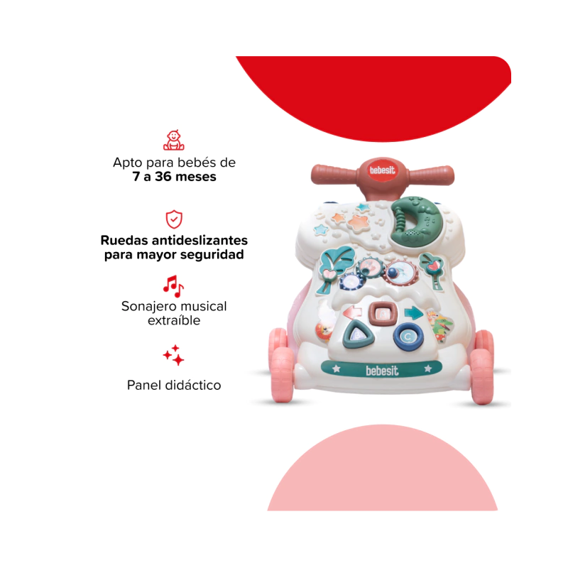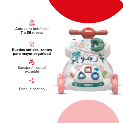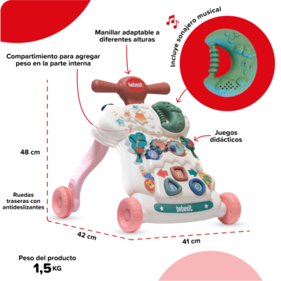 El Caminador Bebesit con música y panel didáctico es el compañero perfecto para los primeros pasos. Estimula la coordinación, el equilibrio y el desarrollo motriz del bebé mientras se divierte explorando sonidos, formas y colores.