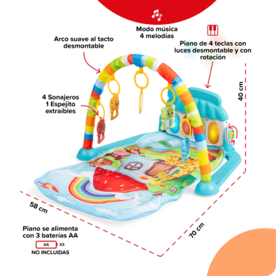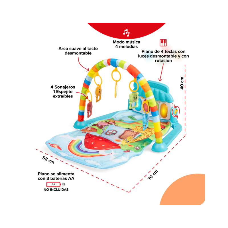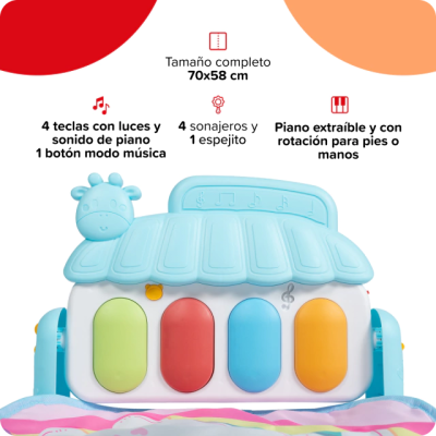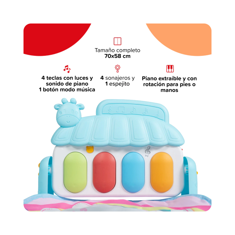El Gimnasio Piano Bebesit transforma la hora de juego en una aventura en la granja. Colores brillantes, personajes adorables y un piano con luces y sonidos acompañan al bebé en su desarrollo motor y sensorial, haciéndolo parte de un mundo lleno de estímulos.