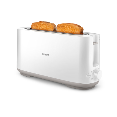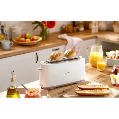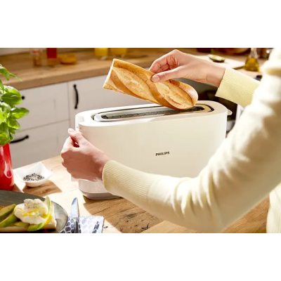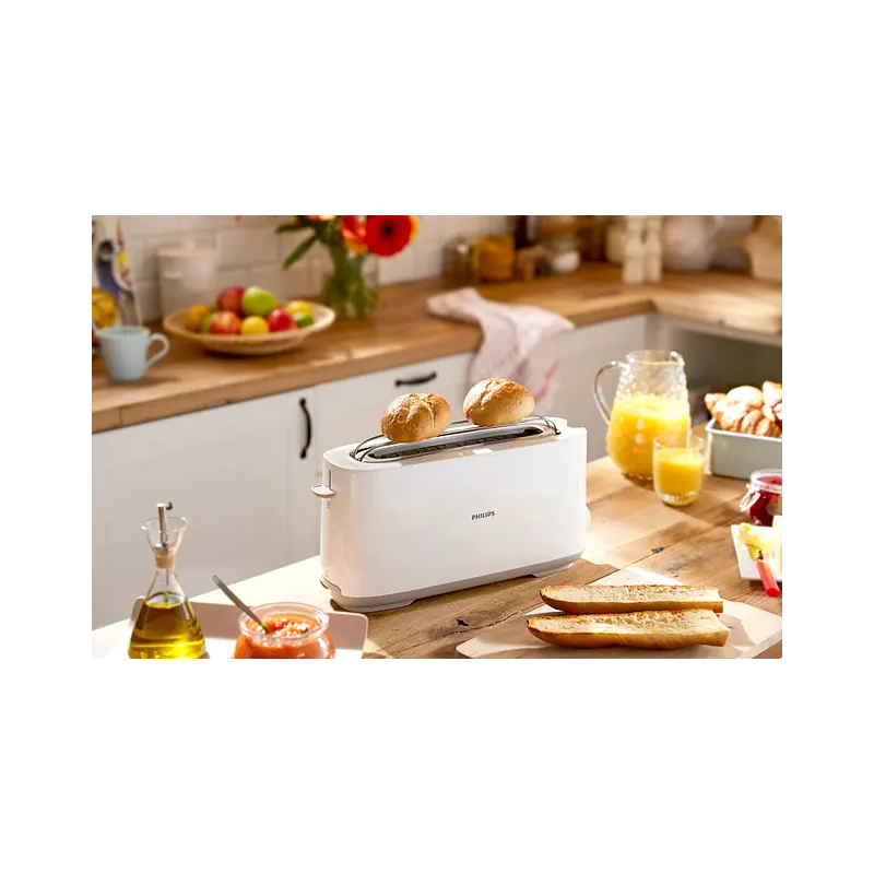 Tostadora de ranura larga con 8 posiciones y una ranura extra ancha para un resultado uniforme y dorado, sin importar lo que tueste o cómo le guste comer su pan. El soporte para panecillos incorporado tiene capacidad para varios tipos de panecillos y croissants