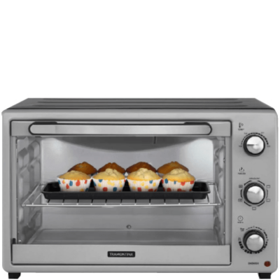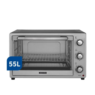 Es un horno eléctrico con un diseño moderno en color negro. Cuenta con una puerta de vidrio amplia y perillas de control accesibles. Además, dispone de tres posiciones de bandeja para seleccionar según el tipo de alimentos que se quieran preparar. Su capacidad es de 55 litros. Accesorios incluidos: Rejilla de Grill, y Bandeja Asadera Esmaltada.