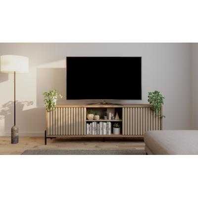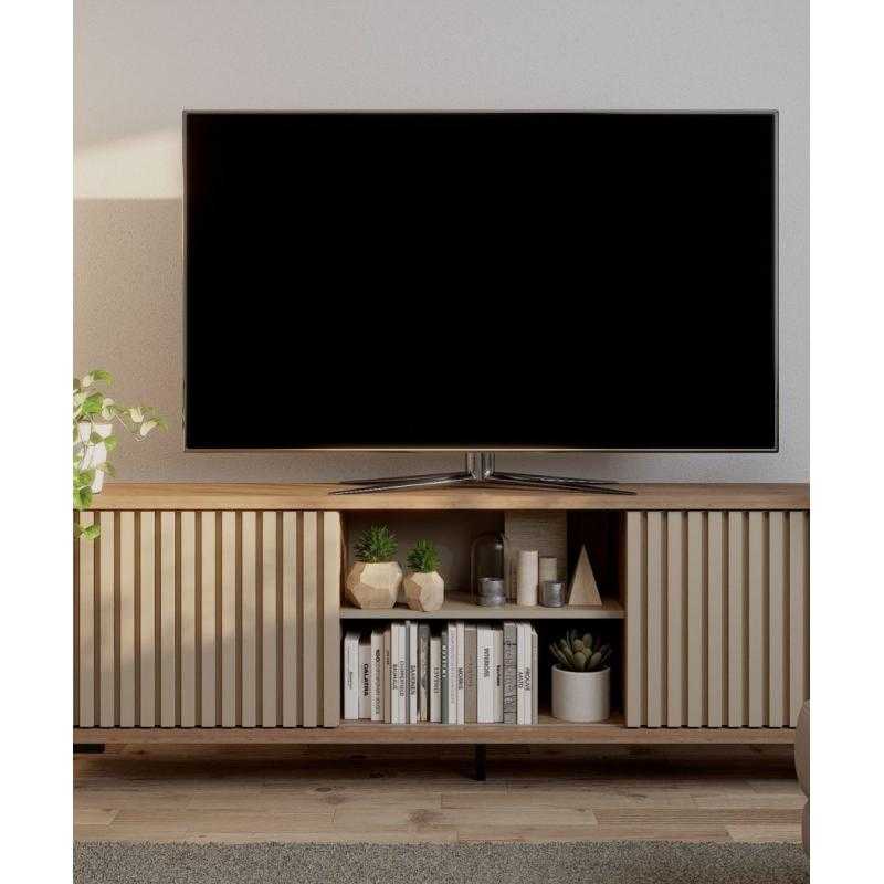 Rack varillado 2 puertas corredizas y un estante. Patas de hierro con pintura epoxi. Para TV de 65″. Fabricado con varillas de 15x25mm en MDF, placa MDP en 15 y 25 mm de espesor. Melamina texturada de alta calidad. Embalaje con caja de cartón y termo contraíble.