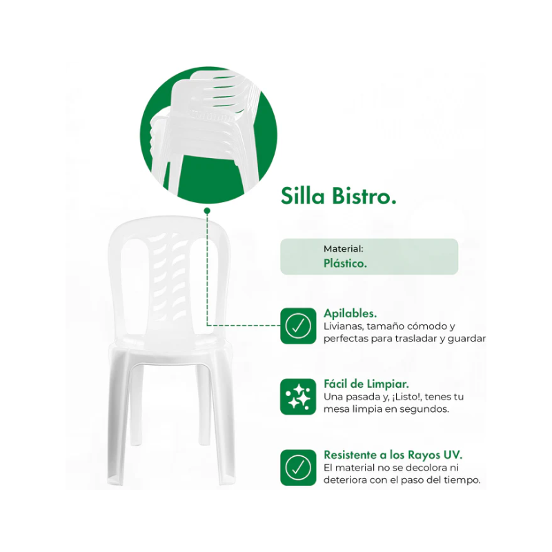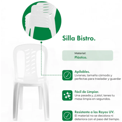 Elegí la Silla Plástica Garden Life Bistro para darle un toque moderno y funcional a tu espacio exterior. Ideal para compartir momentos únicos con familia y amigos, su diseño elegante y práctico la convierte en la opción perfecta para cualquier ocasión.
