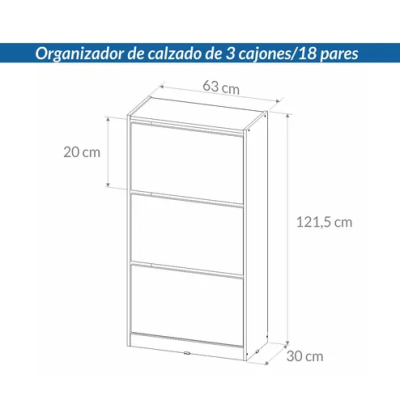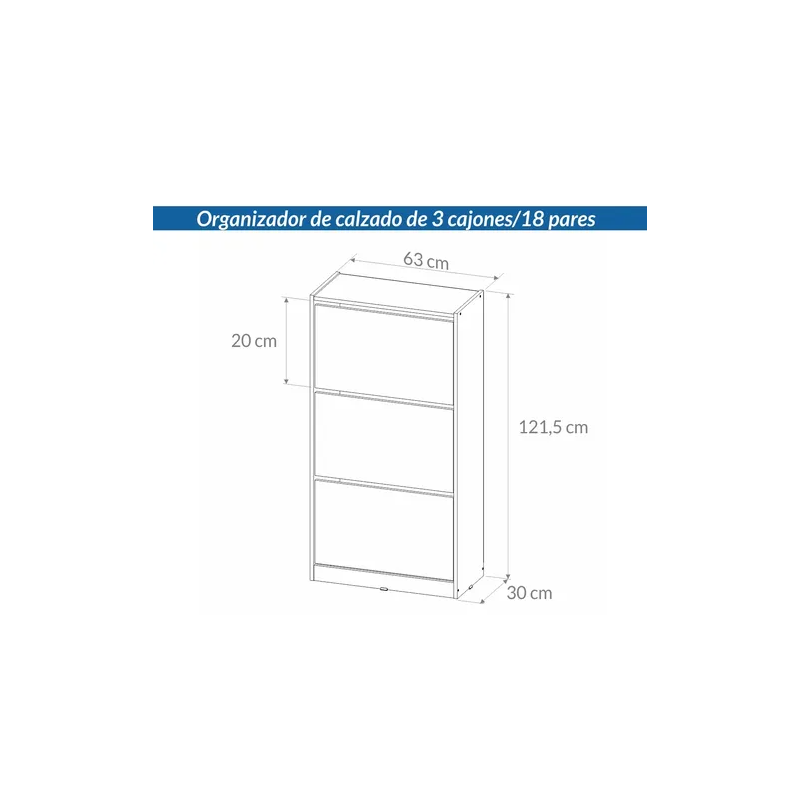Organizador de calzado Homely DOC121, posee tres cajones en los cuales se puede guardar hasta 6 pares en cada uno. Fabricado en tableros de aglomerado de 15mm de espesor con aplicaciones decorativas.