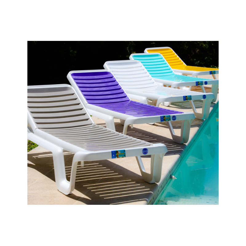 Reposera Hawaii con parrilla plástica de polipropileno. El respaldo permite cinco posiciones de regulación, y con la posibilidad de reclinar toda la espalda hasta una posición de 85 grados. Cómodas y super resistentes. Contiene ruedas para su fácil traslado