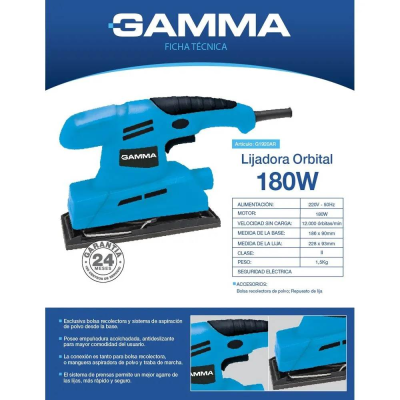 Transformá tus proyectos de bricolaje con la Lijadora Orbital Gamma G1920. Diseñada para el uso doméstico, esta herramienta es ideal para el lijado de terminación y la eliminación de pequeñas marcas en superficies tratadas previamente. Gracias a su potente motor de 180W, podrás realizar trabajos con mayor rapidez y eficiencia.