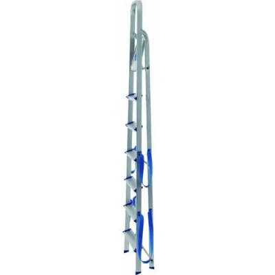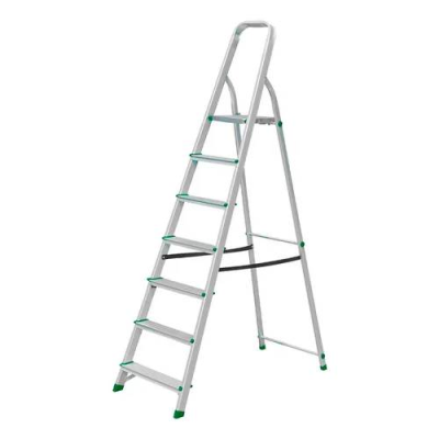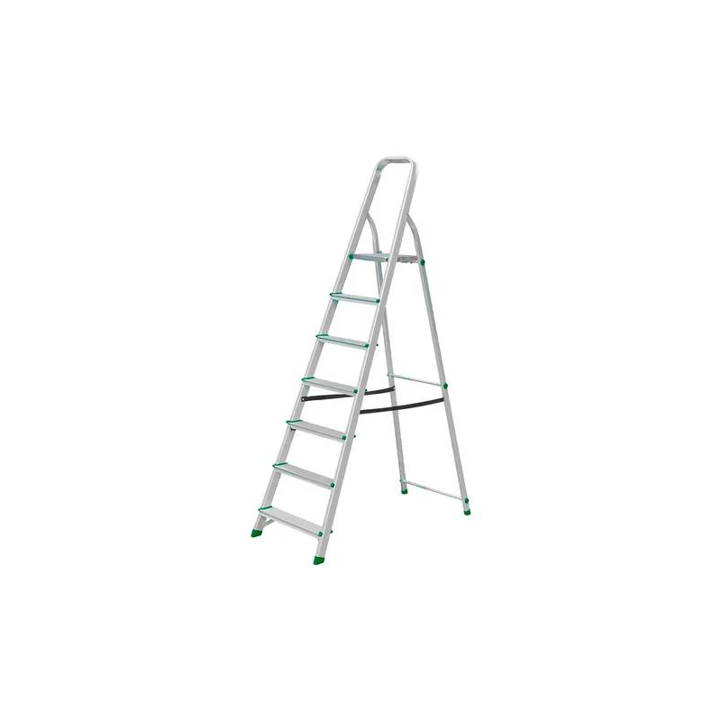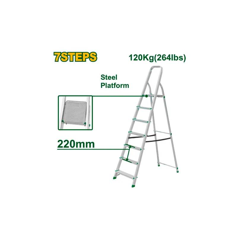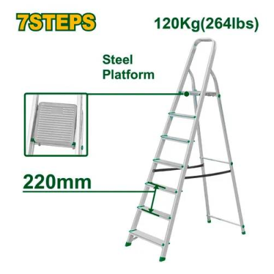Plataforma superior con trabamiento automático en aluminio. Patas y escalones antideslizantes. Escalones con cinta de seguridad