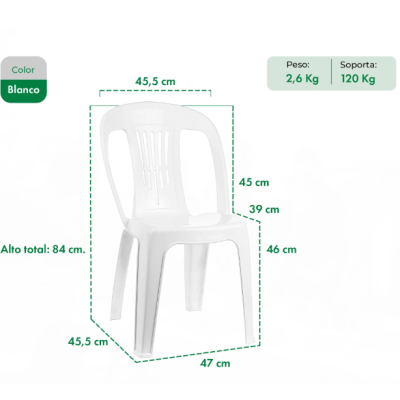Fabricada con **plástico virgen de alta calidad**, la silla Antonella asegura una **resistencia superior y una durabilidad extrema**. Está diseñada para soportar un uso intensivo y un peso máximo de hasta **140 kg**, brindando la máxima seguridad y estabilidad para vos y tus invitados. Su construcción robusta no compromete la comodidad, ofreciendo un asiento confortable para largas reuniones o momentos de relax.