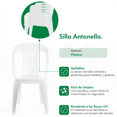 La principal ventaja de la silla Antonella es su capacidad **apilable**, lo que te permite organizar y almacenar múltiples unidades de forma eficiente, ahorrando un valioso espacio cuando no las utilizás. Esto la convierte en una elección insuperable para espacios reducidos, eventos o cualquier situación donde necesites flexibilidad en la disposición de los asientos, manteniendo siempre la estética y el orden.
