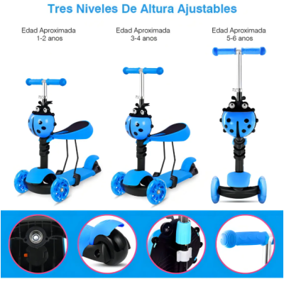 Esto hace que este vehículo tenga una vida útil increíblemente larga. El 2 en 1 es un scooter ideal para cubrir varias etapas en el crecimiento de un niño. (De 1 a 3 años en formato andador y de 3 a 9 años en formato monopatín).