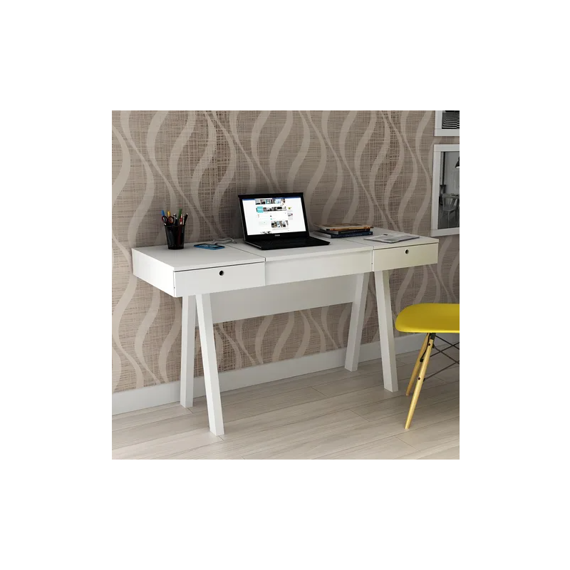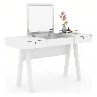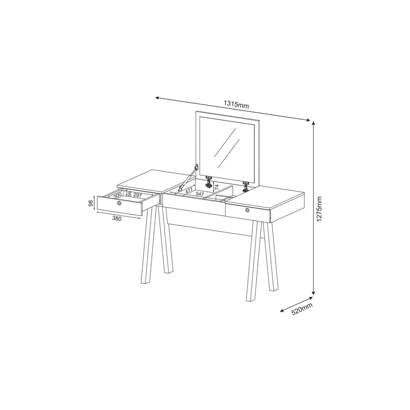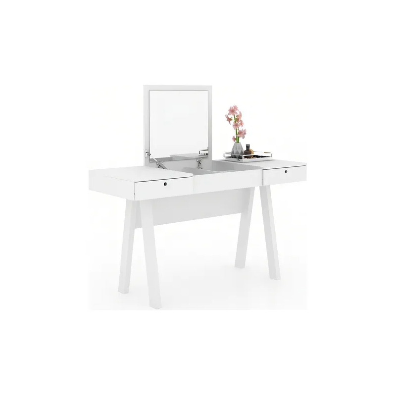 Cuenta con 2 cajones con correderas metálicas con capacidad para hasta 3 kg, asas integradas, espejo de 45 x 35 cm y 3 mm de grosor, parte superior inclinable con bisagras metálicas y pistón de gas, apertura a 90°, divisores organizadores internos y también se puede utilizar como escritorio.