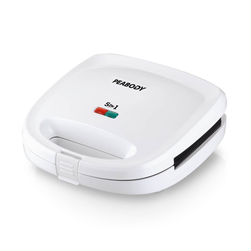 La sandwichera Peabody PE-SW6141 tiene un clásico diseño en color blanco con indicador luminoso de encendido y apagado en la parte superior. Su potencia es de 700 watts y cuenta, además, con superficie antiadherente y manija fría al tacto.
