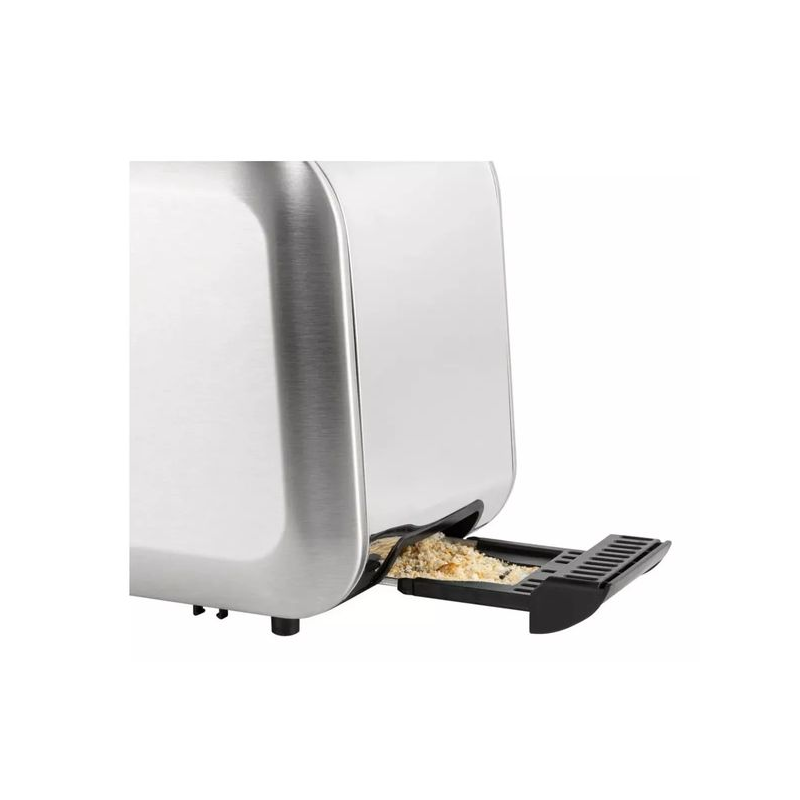 La tostadora ATMA TO8020IP posee un cuerpo de acero inoxidable con capacidad para 2 rebanadas de pan. Su diseño ofrece una bandeja recolectora de migas para facilitar su limpieza, una base antideslizante para que se mantenga en su lugar y un práctico enrolla cable.