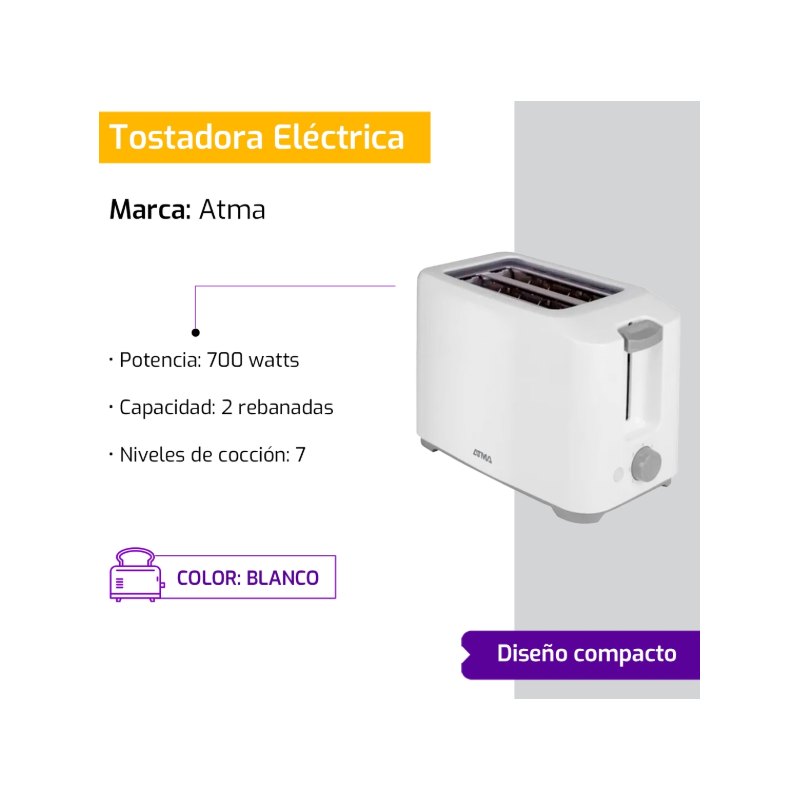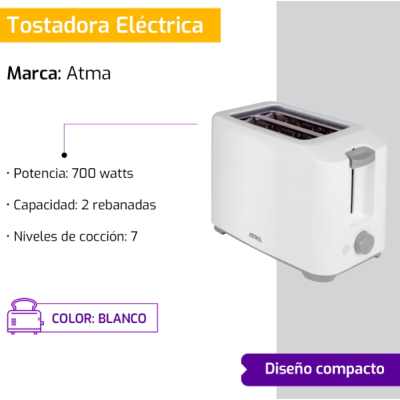 Con la tostadora Atma TO2180WN te asegurarás un resultado parejo y crujiente. Preparar colaciones será una tarea sencilla y práctica. ¡Hacelas con tus ingredientes favoritos! Además, su diseño elegante y funcional destacará en tu cocina.