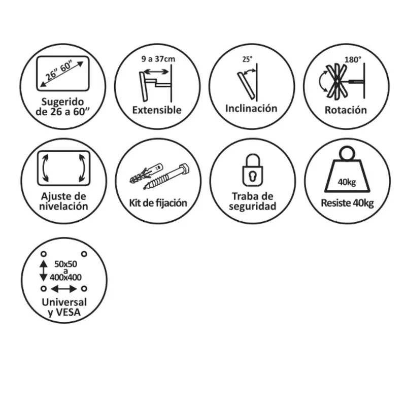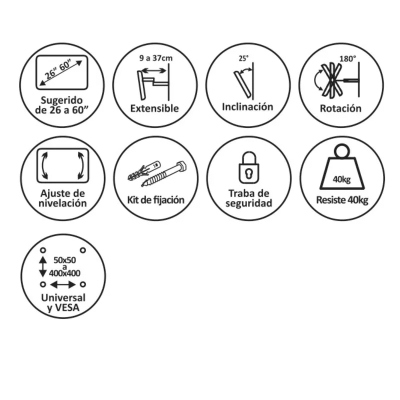Su robusta construcción permite soportar hasta 40 kg, asegurando la estabilidad de tu televisor. Con un sistema de inclinación de 25º y rotación de 180º, podrás ajustar la posición de tu pantalla para una visualización cómoda desde cualquier ángulo. Incluye un kit de instalación completo, lo que facilita su montaje en la pared. Su diseño articulado y fijo, junto con la distancia máxima de 37 cm y mínima de 9 cm de la pared, lo convierten en una opción ideal para cualquier habitación.