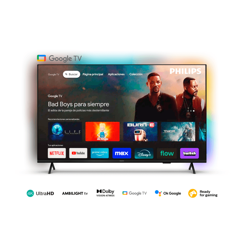 La acción salta fuera de la pantalla con este Google TV 4K de Philips. El contenido HDR se ve genial y Ambilight hace que las películas, los programas de televisión y los juegos se sientan más grandes y envolventes. Dolby Atmos te ofrece un sonido excelente que combina con una imagen brillante.